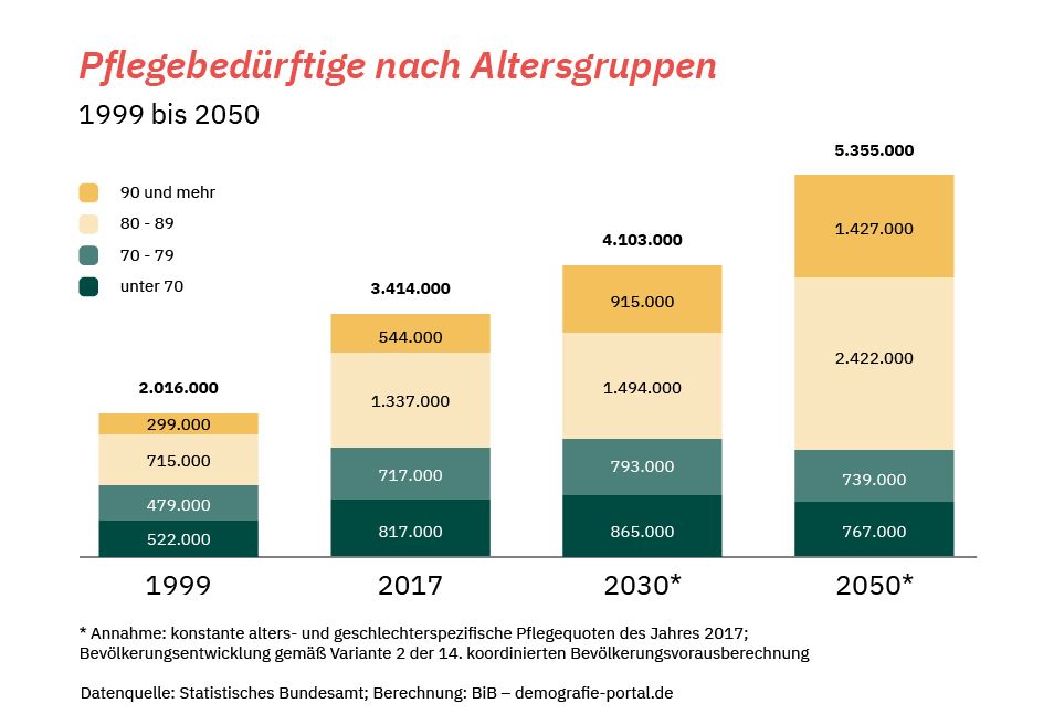 Immer mehr Menschen sind in Deutschland im Zuge der Alterung der Gesellschaft von Pflegebedürftigkeit betroffen. Im Dezember 1999 gab es 2,02 Millionen Pflegebedürftige, im Dezember 2009 war ihre Zahl auf 2,34 Millionen gestiegen und im Dezember 2019 waren 4,13 Millionen Menschen pflegebedürftig im Sinne des Pflegeversicherungsgesetzes (SGB XI). Im Dezember 2021 waren es 4,96 Millionen.